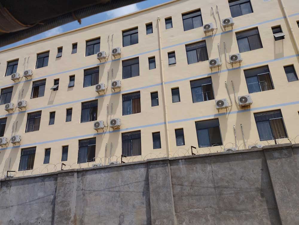 Metal bars cover the dormitory windows on each of the five floors, suggesting they are designed to keep people in.