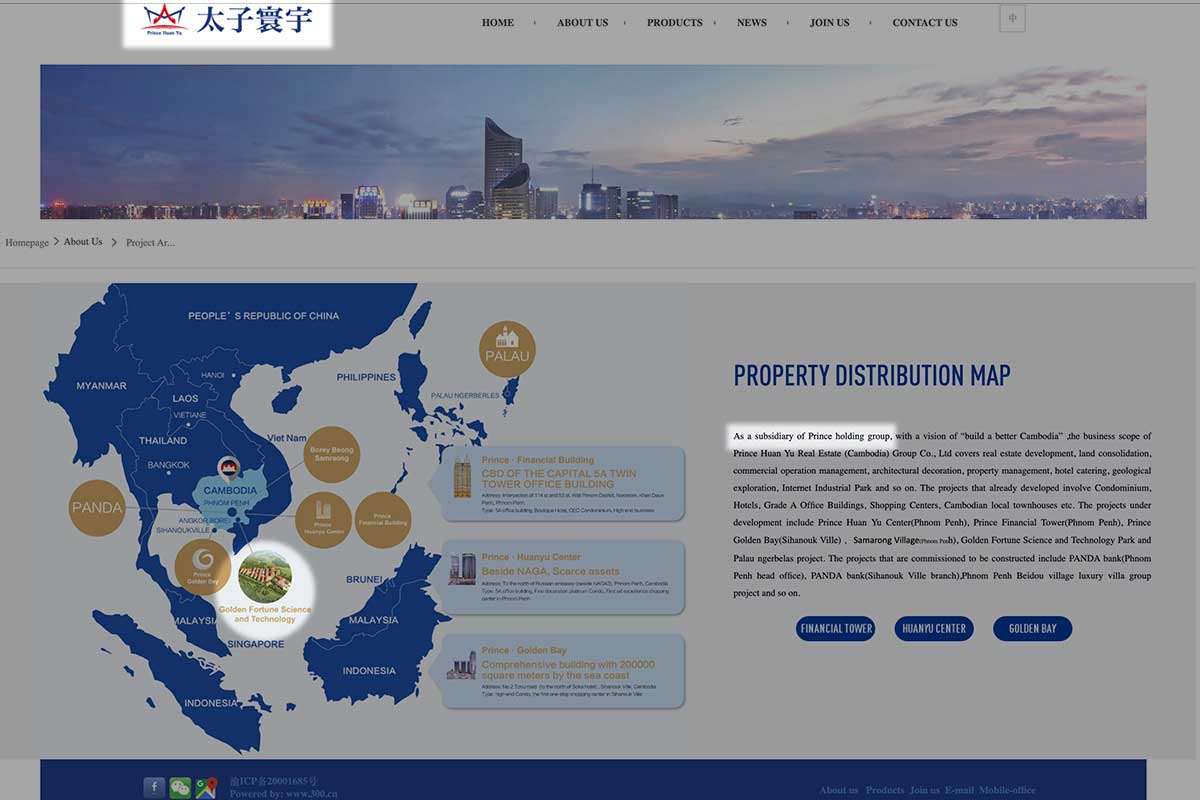 The Golden Fortune compound is listed on the official website of Prince Huan Yu Real Estate – a subsidiary of the Prince Group – and its location is pinpointed on its “property distribution map.”